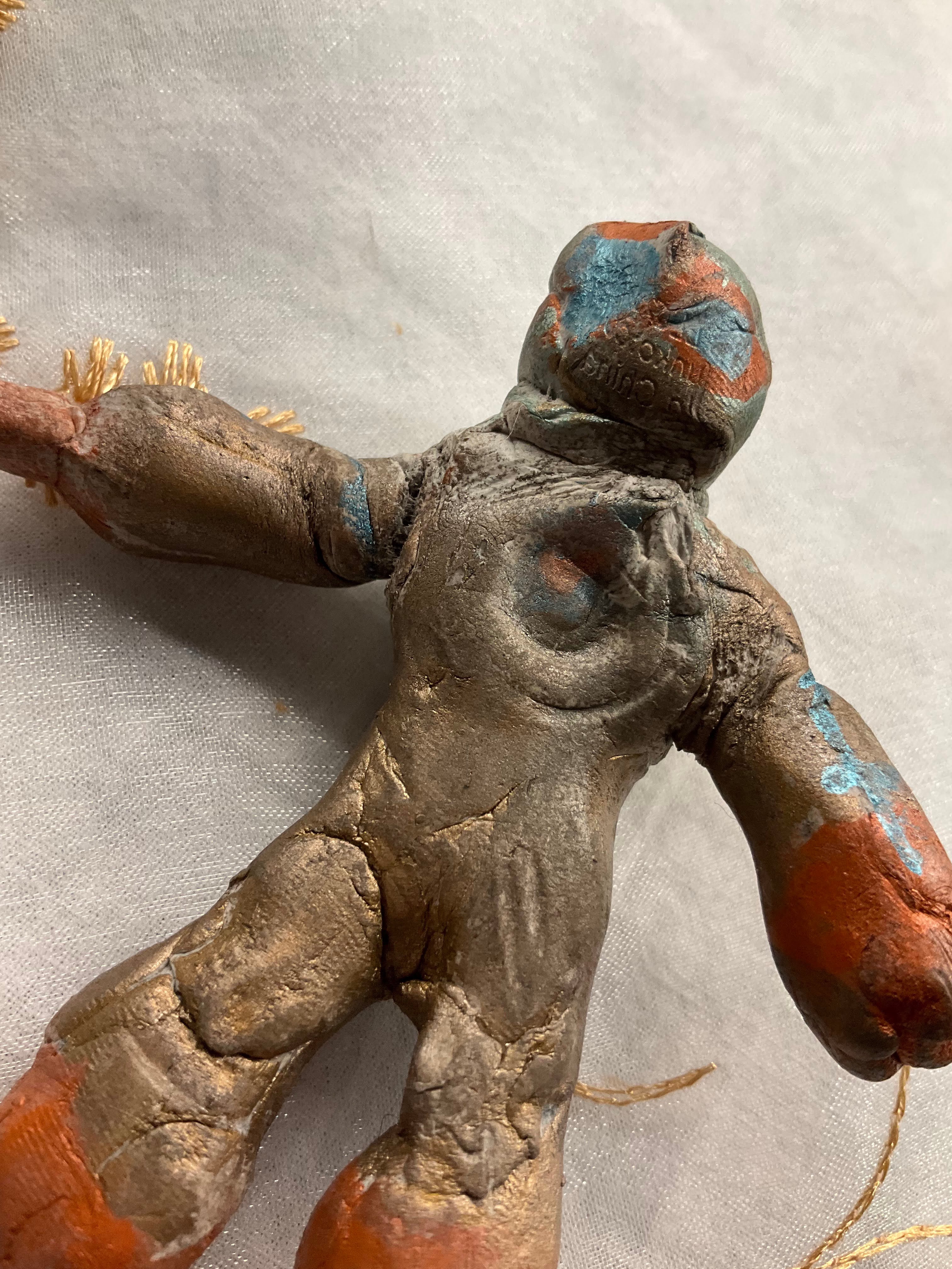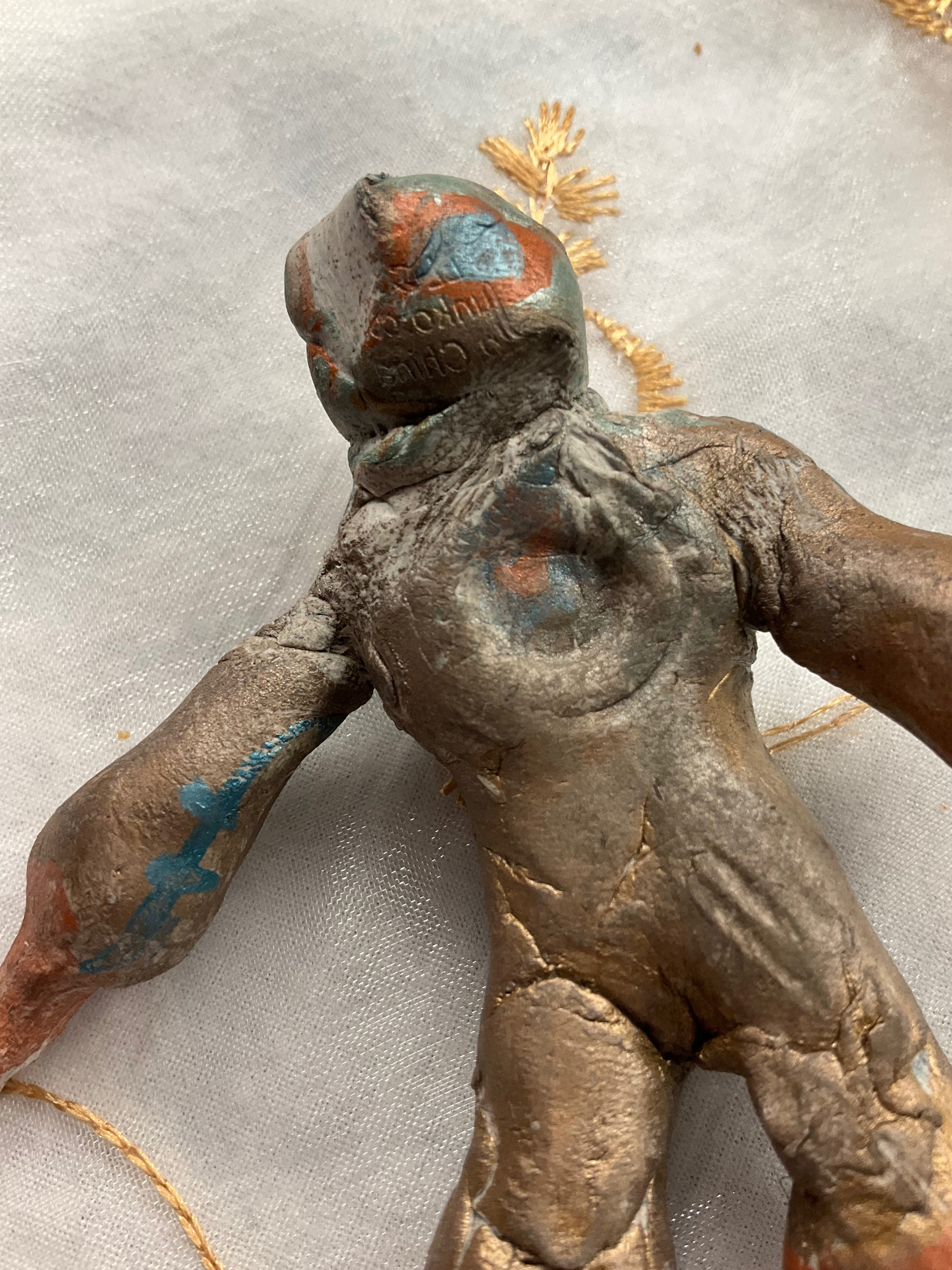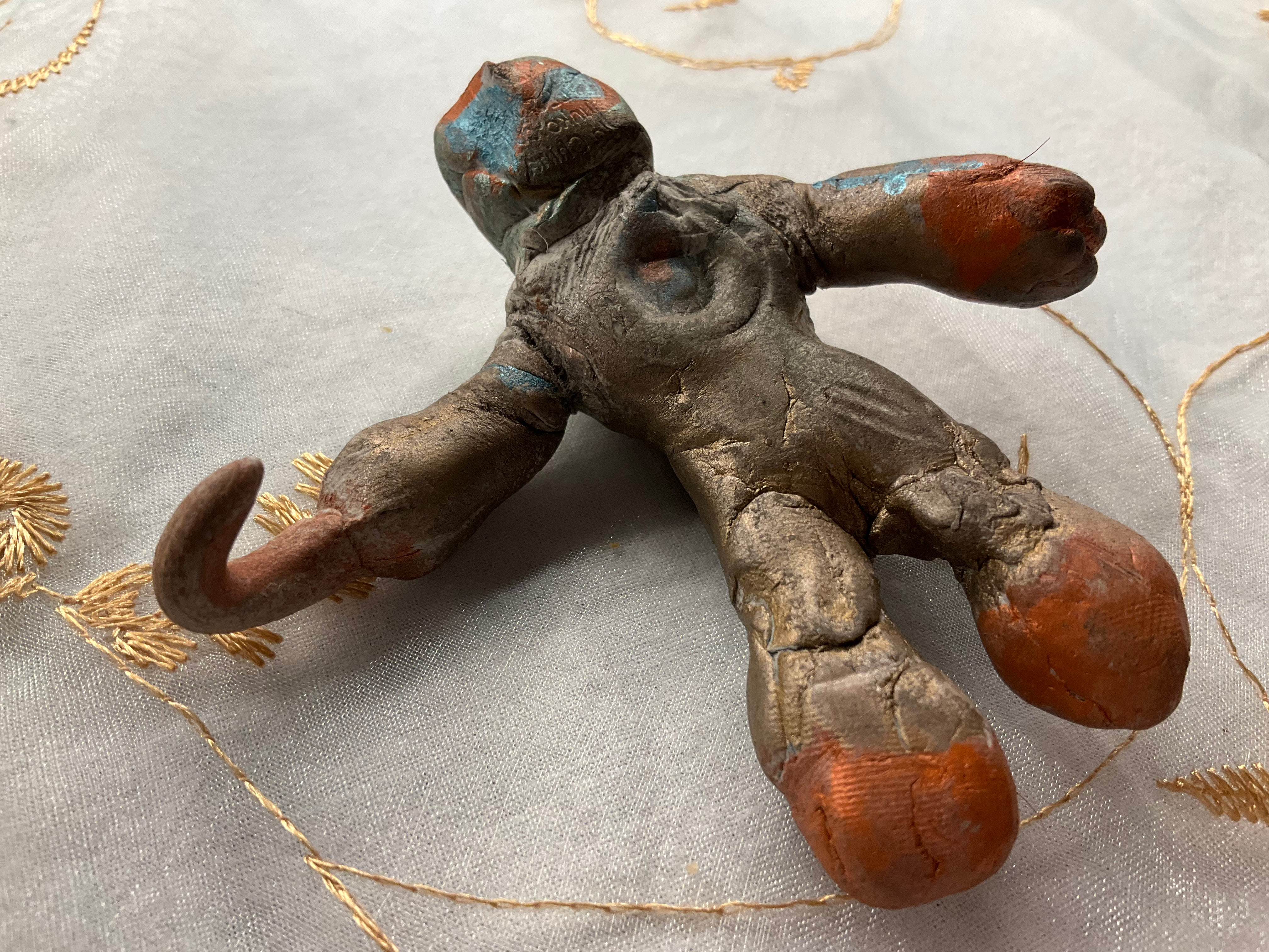 In the dim, flickering light, the creature loomed—its form rough, jagged. Its skin was an unsettling mix of mottled gray and rusted hues, cracked and scarred in ways that suggested it had been forged in pain. The right upper limb ended in a grotesque hook, not metallic but organic, like some twisted extension of bone that had burst through decayed flesh.